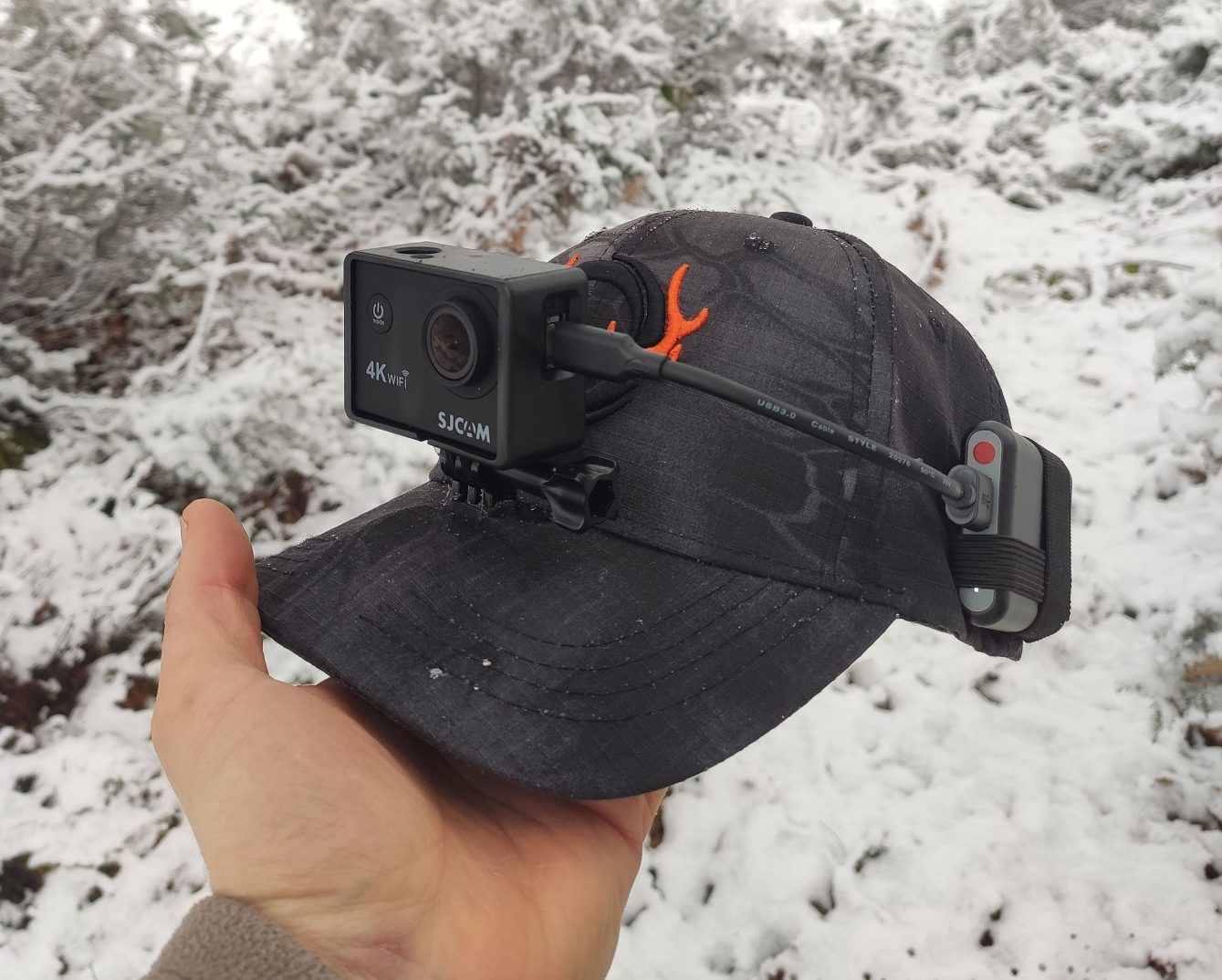 - Gorra con cámara, tarjeta, cable y batería incorporadas.
